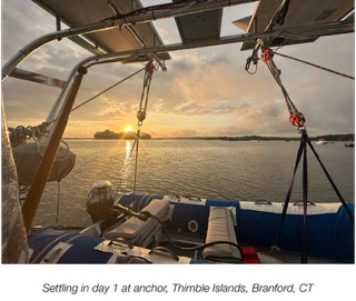 Our first stop of the trip would be Thimble Islands which is a small group of islands on the Northern side of the sound named this way because the islands look like small thimbles sticking out of the water. Its beautiful and can remind you of the Maine coastline. We “dropped” the anchor based on the conditions, lowered the dinghy and headed to town to walk the dog. After a brief walk, a failed attempt to get an ice cream and a dinghy ride back to the boat we settled in for the night. Sophia fished off the forward deck and we sat and enjoyed the view of the sunset and waited for nightfall. Over the years we have used a couple different options for anchor alarms and I have learned a lot from past mistakes made in setting them right now we use anchor pro which seems to work the best of us we set it and now keep the app open on a phone upside-down so the light doesn’t affect us sleeping in our cabin this way it actually alarms when there is a potential issue. As the sun set we turned in for the night, suddenly at 3 A.M. we were startled out of bed. We arose to find the boat dragging in 20-25 knots with the wind coming from the opposite direction than where is was when we turned in, clearly I didn’t recognize the change at this stage in our cruising life. Of course we immediately started the engine with Anna at the helm we safely motored forward and out of the danger of the rocks. A total of a 1/4 mile we dragged from our initial position into the channel and on our way out into the sound. We narrowly escaped rocks, avoided the lobster pots and even missed a moored boat by feet as we frantically worked on raising the anchor and getting the boat back to safety. As I do during the events that create havoc I thought about what could we have possibly done wrong, we skipped a step that our instructor taught us long ago on a previous boat, to back down at a minimum of 2000 RPM. Why? Who knows maybe it was the first night jitters, extra confidence from actually slipping the lines and leaving or maybe it was lack of thought of what needed to be done I think eventually it happens to everyone. Either way the dream could have ended on the first night out but Bogumila had other plans and was looking out for her crew in more ways than one. In the remaining darkness of the night I sat in the cockpit after resetting the anchor and watched the water boil as the sunrise brought in schools of striped bass and bluefish. A quick walk with the dog on shore, breakfast to refuel for the day and a brush off of our egos we picked up the anchor and put an end to our first anchorage with a few new lessons learned.